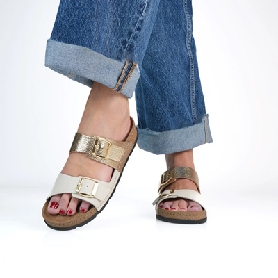 A két, állítható pánt és az aranyszínű csatok gondoskodnak a kényelmes, személyre szabott illeszkedésről. A könnyű, rugalmas, parafa hatású talp puha alátámasztást ad, így ideális választás a mindennapokra – akár városi sétához, akár otthoni pihenéshez.