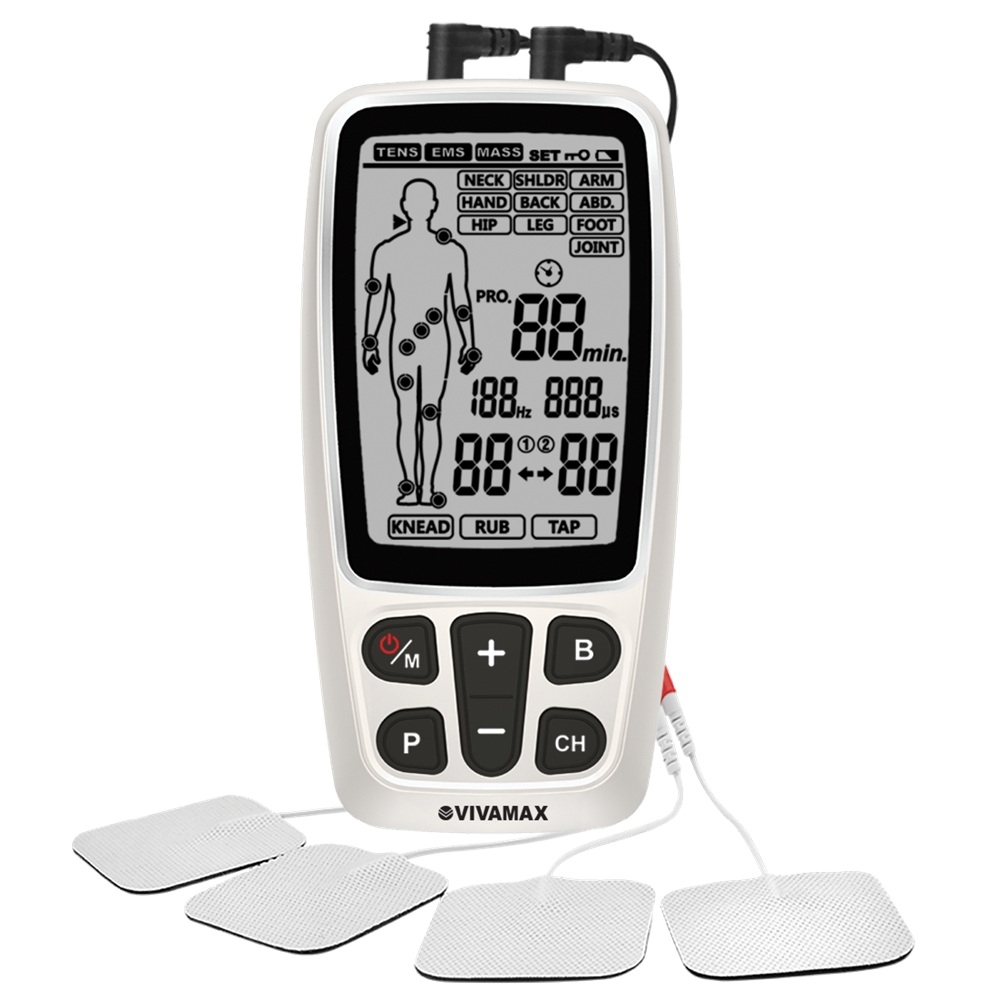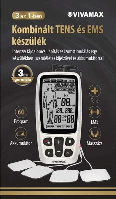 TENS, EMS és masszázs: intenzív fájdalomcsillapítás és izomstimulálás egy készülékben, szemléletes kijelzővel, akkumulátorral és modulált móddal!