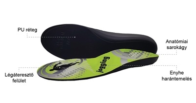 Az anatómiai sarokágy stabilizál, az enyhe harántemelés támogatja a lábboltozatot, a rugalmas PU-réteg pedig kényelmes lépésérzetet és hatékony ütéscsillapítást ad.