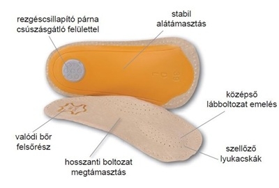 Háromnegyedes, valódi bőr talpbetét, haránt-, és lúdtalpemeléssel, rugalmas sarokággyal.