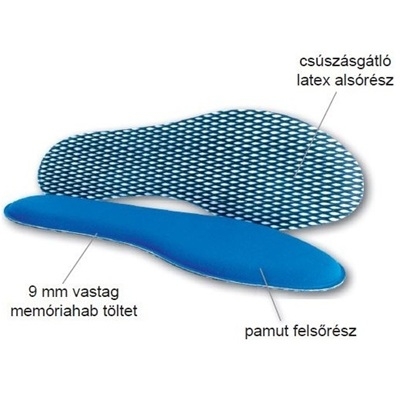 Memóriahabos talpbetét pamut felsőrésszel és csúszásgátló, latex alsórésszel. A talpbetét 9 mm vastag emlékező hab középréteggel rendelkezik, mely felveszi a láb formáját és kellemes puha érzetet biztosít, miközben pihenteti a fáradt lábakat. Kipárnázza a talp azon részeit, melyekre járás közben erősebb nyomás terhelődik.